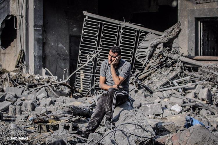A Palestinian man sits on the rubble of his destroyed house, in confusion and great sadness as a result of the loss of all his family members and the homes of his relatives
